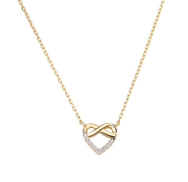 collana AMEN gioielli realizzata in argento 925 rodiata giallo con pendente a forma di cuore e infinito centrale. Il cuore è impreziosito da un pavè di zirconi bianchi. Lunghezza della catena : 40 cm + 5 cm di extender